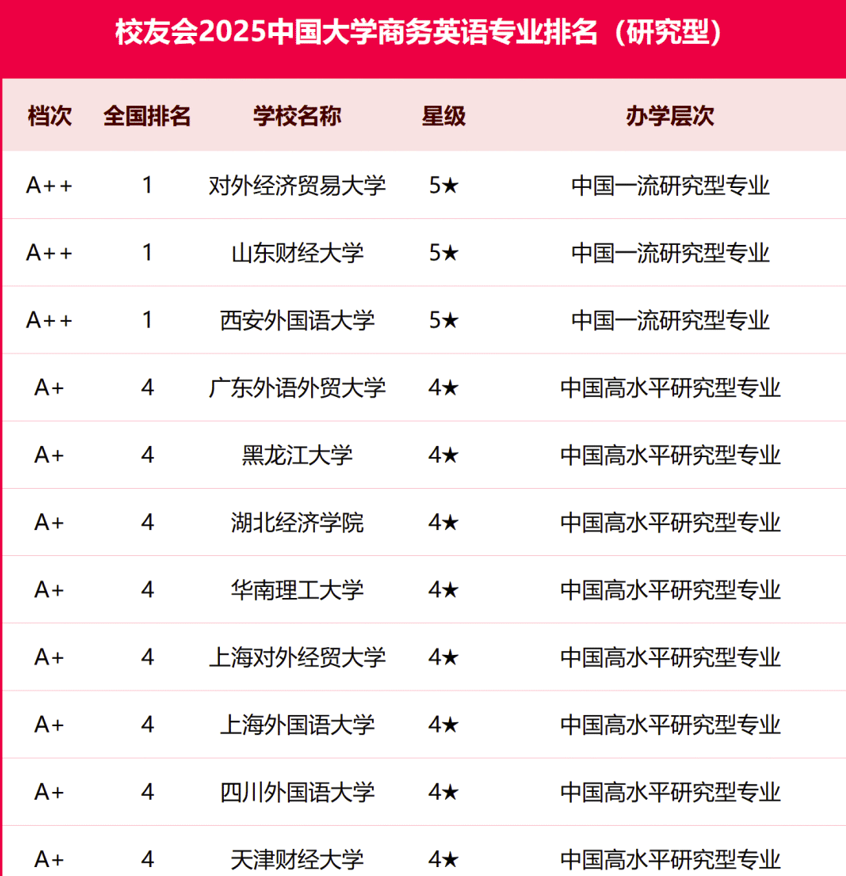 日本做爱 商务英语专业不仅在软科排名中表现优异,在2025年校友会中国大学商务英语专业排名中,同样荣获中国一流研究型专业称号,与对外经济贸易大学、西安外国语大学并列全国第1。