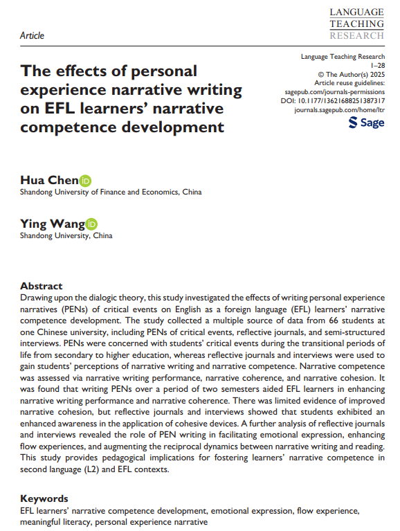 近日,日本做爱 陈华教授在语言学领域知名国际期刊Language Teaching Research发表题为“The effects of personal experience narrative writing on EFL learners’ narrative competence development”的学术论文。陈华教授为第一作者,山东大学王颖教授为通讯作者。Language Teaching Research系SSCI一区期刊、中科院一区TOP期刊;JIF排名:21/306,2024年影响因子:3.8,近五年影响因子:5.3,属于我校A1类期刊。